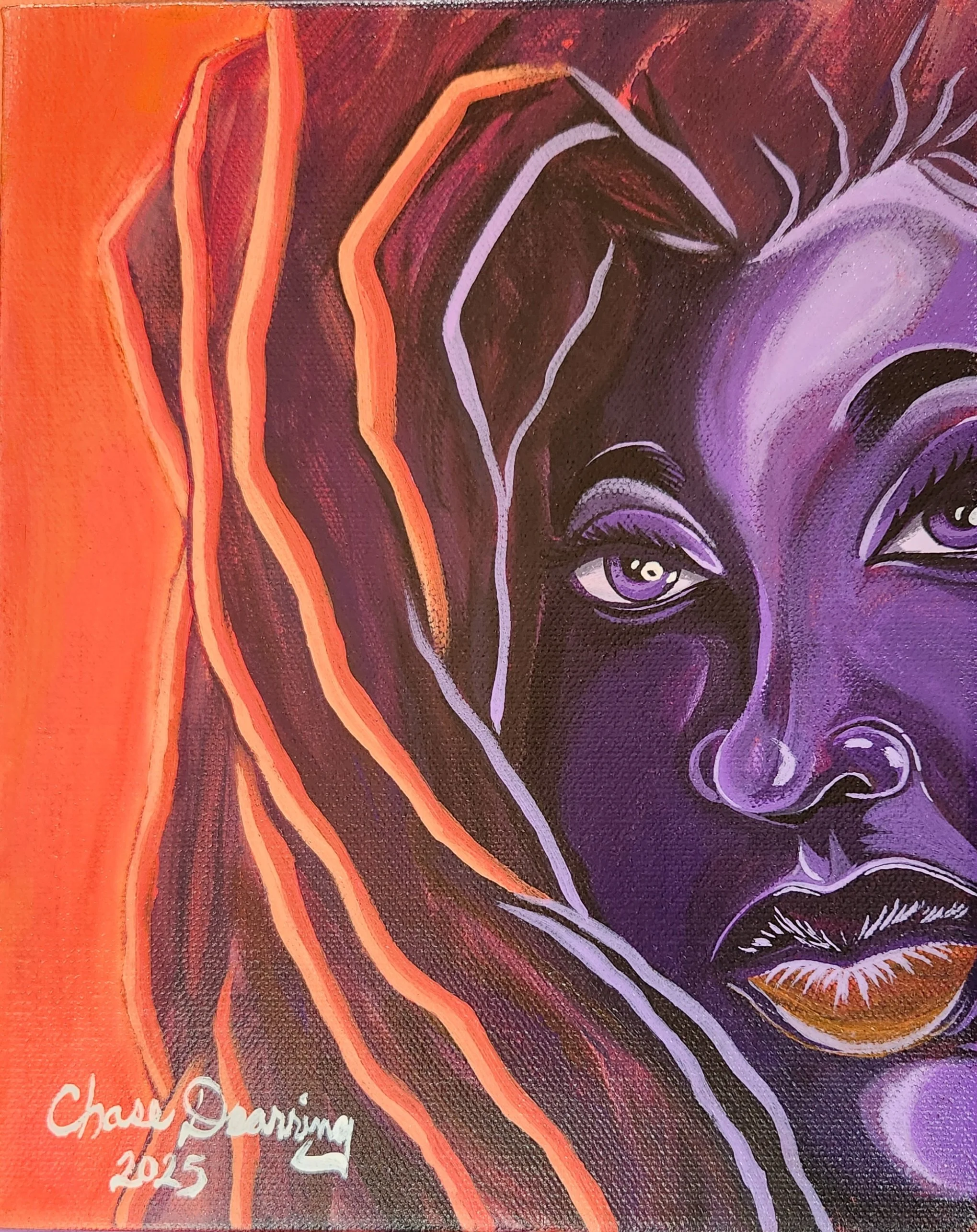 A black woman with locs, in the orange & purple color scheme!